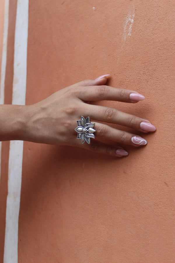 Celebrate purity and grace with this beautifully handcraftedSilver Lotus Oxidized Ring, made from authentic 92.5 sterling silver. Featuring a delicately carved lotus design, this ring symbolizes spiritual growth, serenity, and renewal. The antique oxidized finish adds depth and character, highlighting the fine detailing of the petals.